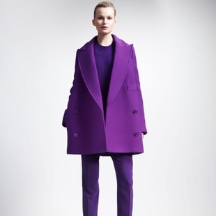 歐洲站2014秋冬裝新款紫色雙排扣中長款羊毛呢子大衣外套羊毛西裝 /