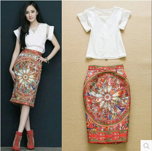 2015爆款楊冪同款氣質顯瘦V領襯衫 復古印花包臀半裙兩件裙套裝 /