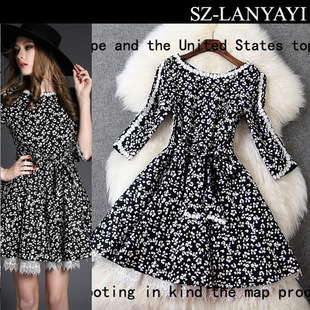 2015早春新款歐美優雅氣質印花刺繡圓領修身顯瘦連衣裙T2759 /