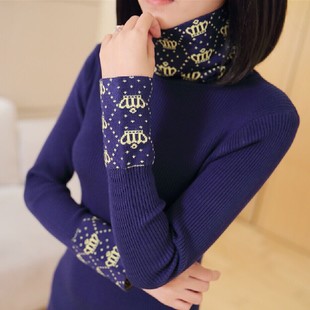 2014秋裝新款韓版長袖針織衫女套頭高領皇冠中長款女裝打底衫毛衣 /