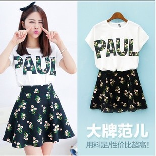 代理韓版大碼女裝小清新碎花少女連衣裙夏學生短袖裙子套裝兩件套 /