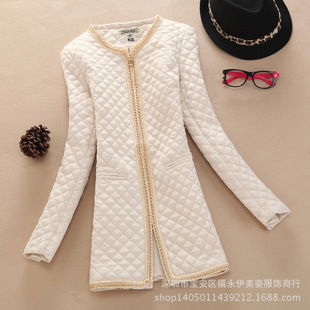 簡介: 建議零售價 ¥598.00 貨源類別 現貨 產地 北京 面料 聚酯纖維 里料 滌綸塔夫綢 填充物 棉 風格 歐美 衣長 中長款(65cm<衣長≤80cm) 袖長 長袖 版型 修身型 領型 無領 是否有毛領 無毛領 是否連帽 不連帽 是否有腰帶 無腰帶 門襟 拉鏈 流行元素 金屬鏈鑲邊 主圖來源 實拍無模特 上市年份/季節 2014秋季 顏色 米色(全網首發),黑色(全網首發),藏藍(全網首發) 尺碼 M,L,XL,XXL,XXXL,XXXXL,5XL