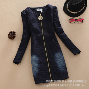 2014秋冬新款女裝 歐美大牌修身牛仔外套格紋PU棉大碼牛仔連衣裙 /