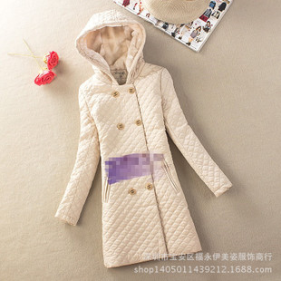 2014新款秋冬歐美大牌時尚氣質雙排扣加大碼連帽修身保暖長款棉衣 /