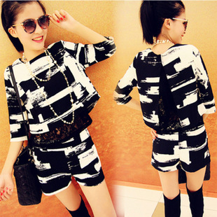 2015春裝抽象印花后背開叉蕾絲時尚拼接七分袖上衣+短褲套裝 /