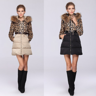 2014秋冬新品歐洲站外貿(mào)高檔女裝時(shí)尚大毛連帽領(lǐng)長袖豹紋羽絨服 /