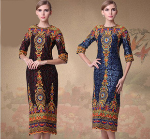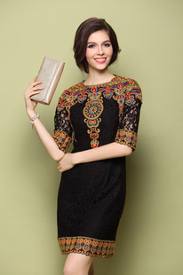 2015春秋復(fù)古宮廷重工刺繡花修身長裙 歐美大牌名媛中袖連衣裙子 /