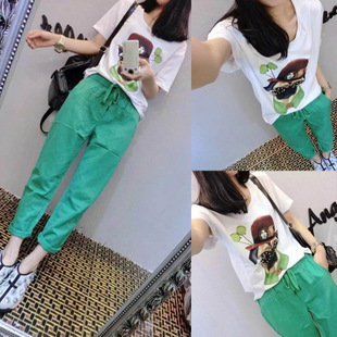 歐洲站2015夏裝新款短袖印花T恤衫上衣九分褲時尚套裝女9703 /