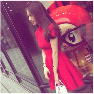 韓國代購2015夏裝新款女裝明星同款修身A字裙針織紅色連衣裙9705 /