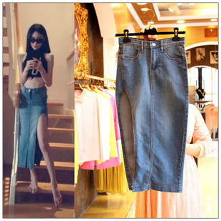 2015春夏新款歐美李小璐同款性感側開叉牛仔包臀顯瘦半身裙長裙 /