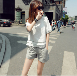 2015歐洲站夏季短袖棉麻時尚兩件套氣質名媛亞麻短褲套裝女 /