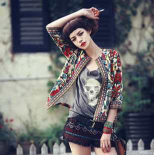 2015歐美春裝新款女 七分袖刺繡印花民族風短外套女夾克薄 /