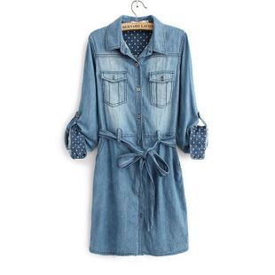 【代理專拍】新款翻領長袖系帶大碼女牛仔連衣裙文藝口袋牛仔裙 /