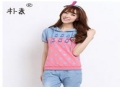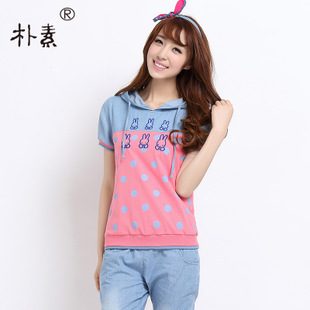 樸素2014少女學生裝新款 撞色卡通印花刺繡連帽短袖T恤 女 夏季 /
