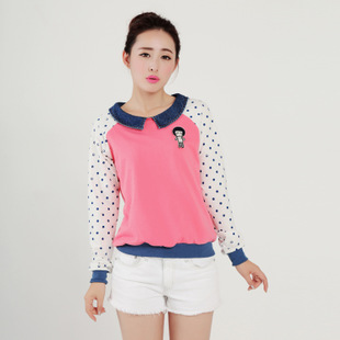 樸素2013秋裝新款 甜美撞色小波點 牛仔拼接娃娃領長袖套頭衛衣女 /