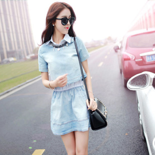 2015夏季女裝潮流新款兩件套牛仔襯衫連衣裙套裝 /