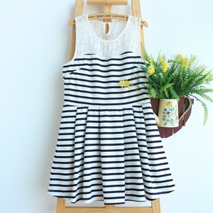 日本原單高端刺繡蕾絲拼接 大裙擺條紋背心連衣裙 /