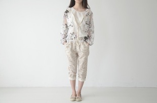女裝批發 夏季新款印花棉麻五分褲蕾絲鉤花拼接休閑褲 /