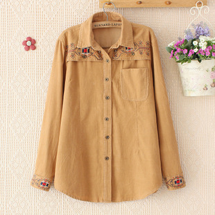 文藝范刺繡燈芯絨長袖襯衫女秋冬新款2014女裝上衣 條絨打底襯衣 /