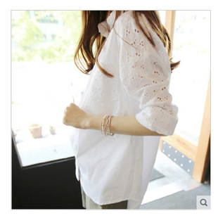 新款韓國學生襯衣女OL長袖鏤空寬松大碼中長款白色打底襯衫女 /