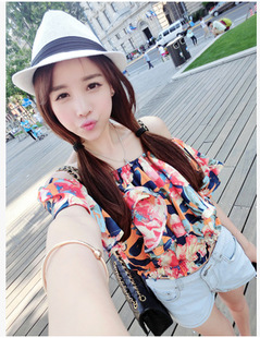 新款夏裝.油畫花朵露肩一字領短款上衣 /