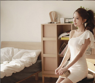 韓版夏季女裝修身包臀性感夜店斜肩連衣裙包臀連衣裙禮服 /
