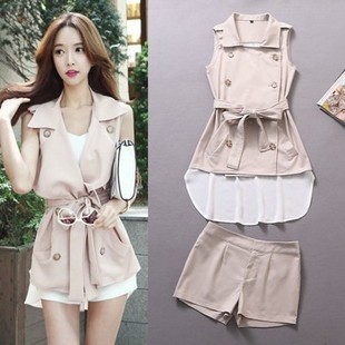 2015歐美大牌 雪紡拼接雙扣風無袖風衣+短褲套裝 /