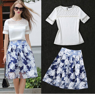 歐洲站春夏新款鉤花蕾絲鏤空雪紡上衣套裝碎花A字裙歐根紗兩件套 /