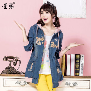 星琴2014春裝新款女裝韓版少女裝中長款牛仔外套學生字母連帽開衫 /