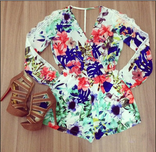 速賣通EBAY熱賣爆款印花蕾絲拼接長袖連體短褲 /