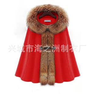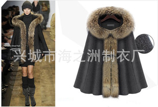 歐美女裝2014冬季新款貉子毛領毛呢斗篷大衣外套披肩呢子風衣批發 /