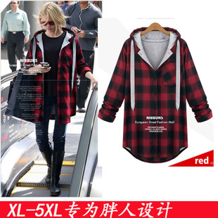 歐美大碼女裝上衣胖MM顯瘦寬松格子連帽衛(wèi)衣女 /