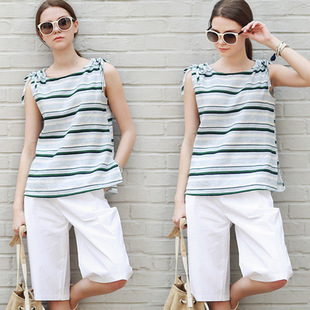 2015夏裝新款時尚圓領無袖棉麻上衣+棉麻褲套裝女裝批發 /