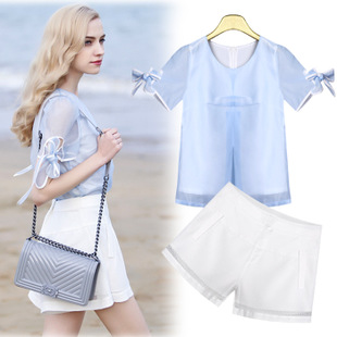 2015夏裝歐根紗雪紡衫上衣短褲兩件套時尚休閑套裝一件代發 /