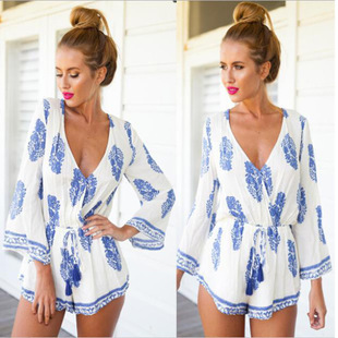 歐美新款熱款波西米亞民族風深v舒適休閑度假喇叭袖連衣褲 /