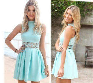 歐美新款無袖修身腰部蕾絲拼接高領派對短裙 /