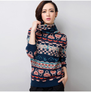針織衫 廠家直銷新款韓版寬松套頭長袖毛衣條紋高領打底衫2014 /