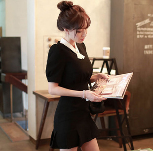 韓國代購正品 甜美小香風領結泡泡袖修身雪紡小魚尾連衣裙 /