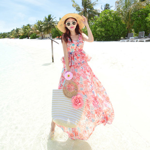 波西米亞長裙海邊度假碎花沙灘裙出游旅行連衣裙雪紡長裙一件代發 /