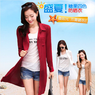 2015夏裝韓版中長款女式外套糖果色夏季雪紡襯衫防曬衣直筒防曬衣 /