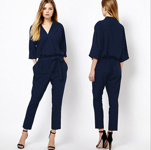 速賣通歐美連體褲2015春夏新款七分袖V領系帶雪紡連體褲連衣長褲 /