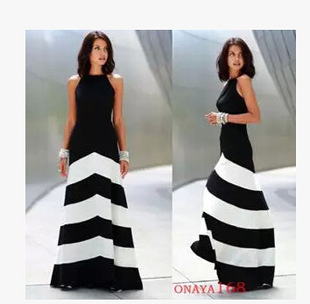 歐美風黑白條紋拼接收腰顯瘦時尚性感長連衣裙禮服 /