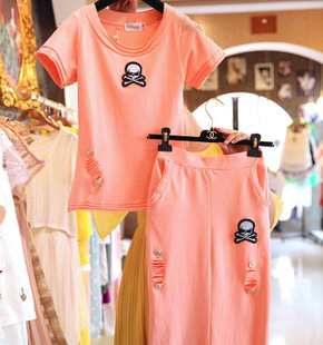 韓國代購2015夏裝女裝新款骷髏頭短袖T恤+包臀半身裙休閑套裝潮 /
