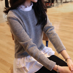 2014秋裝新款羊毛假兩件韓版荷葉邊中長款修身針織衫 /