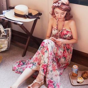 韓國代購夏波西米亞碎花連衣裙雪紡掛脖吊帶長裙沙灘度假裙 /