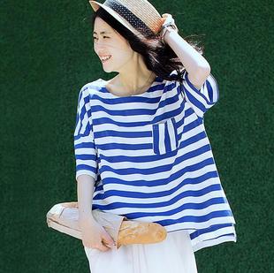 2015夏裝新品圓領藍白條紋T 恤 女 寬松文藝短袖T恤 /