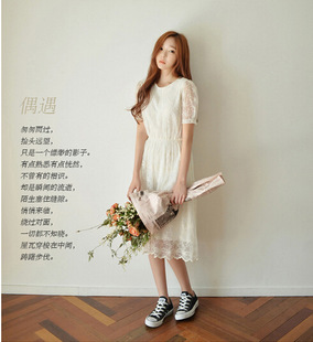 夏季新款中長蕾絲白色長裙沙灘裙顯瘦短袖韓版大碼連衣裙 /