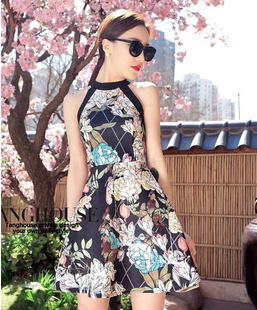 2015掛脖露肩印花高腰修身顯瘦背心連衣裙 誠招代理 一件代發(fā) /
