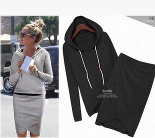 長袖連帽包臀上衣+不規則半身裙休閑兩件衛衣女套裝工廠直銷 /