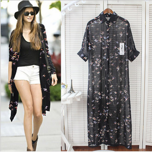 2015歐美風春夏裝新款小鳥印花雪紡寬松長款襯衫立領防曬衣 /